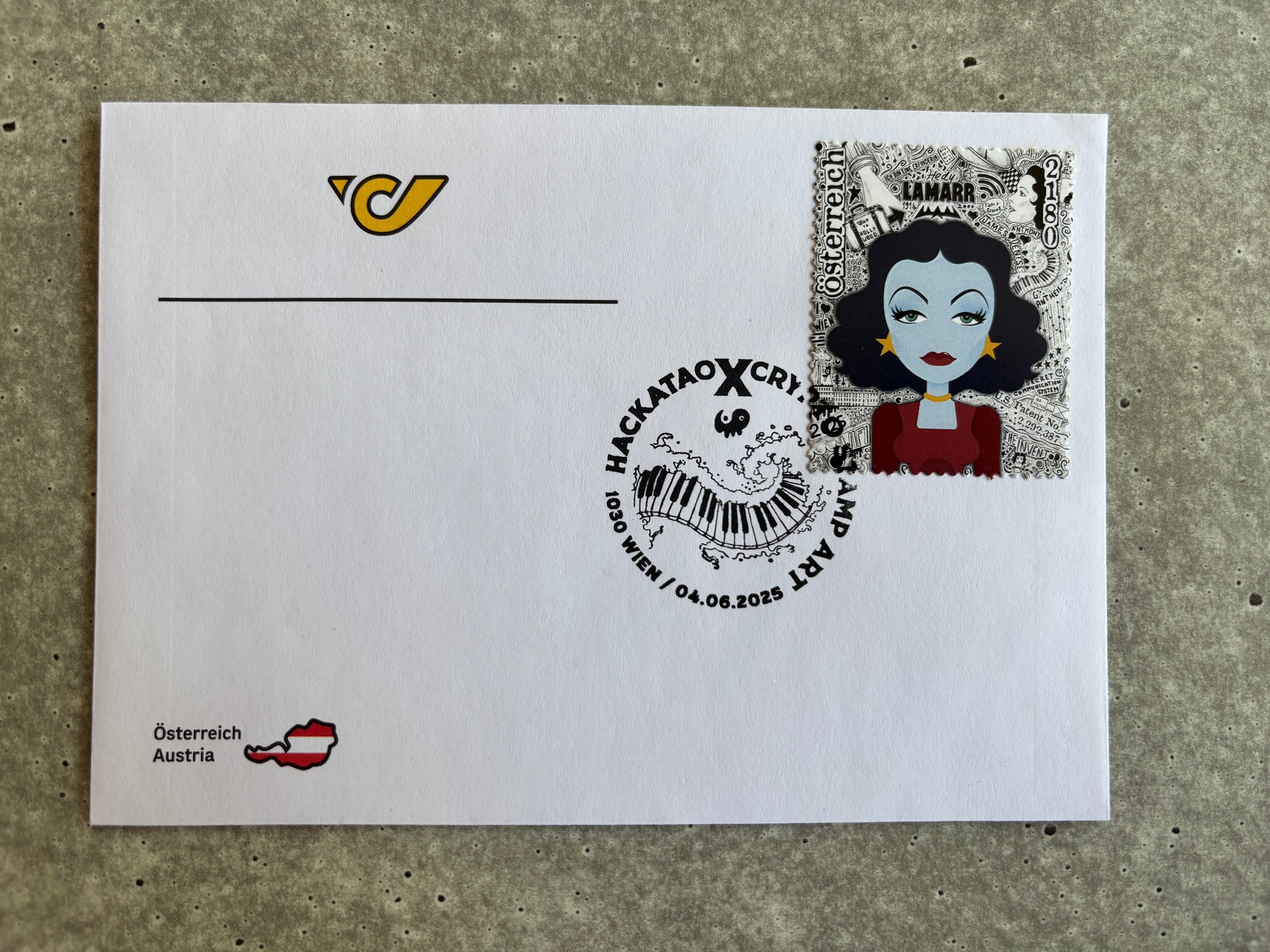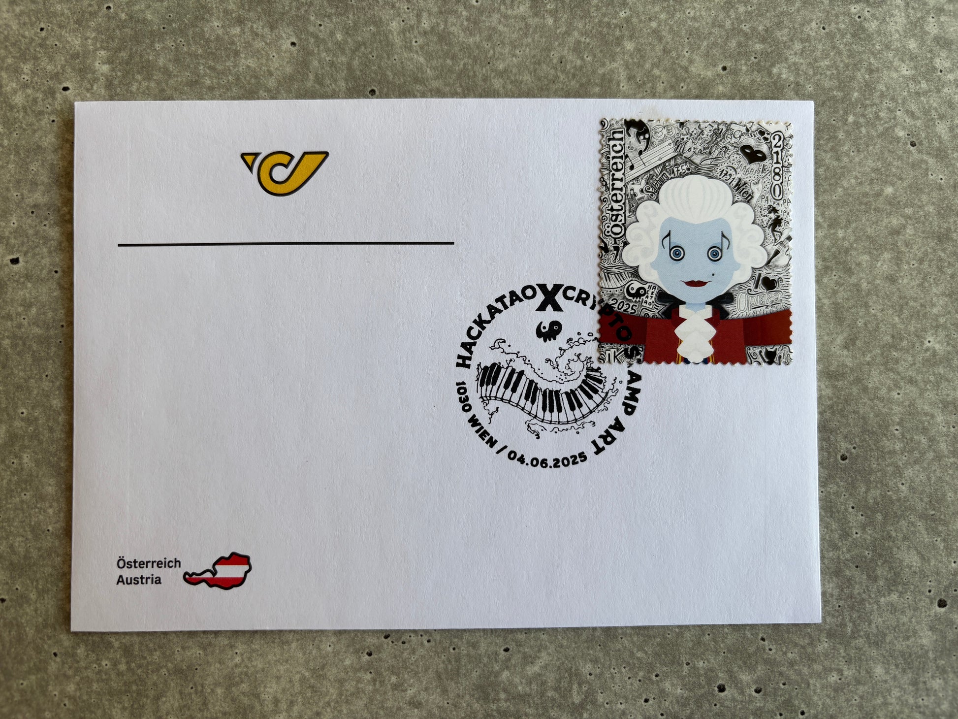 Hackatao Crypto Stamp 2: Llamar and Mozart - FDC Set of all 4 motives (violett)