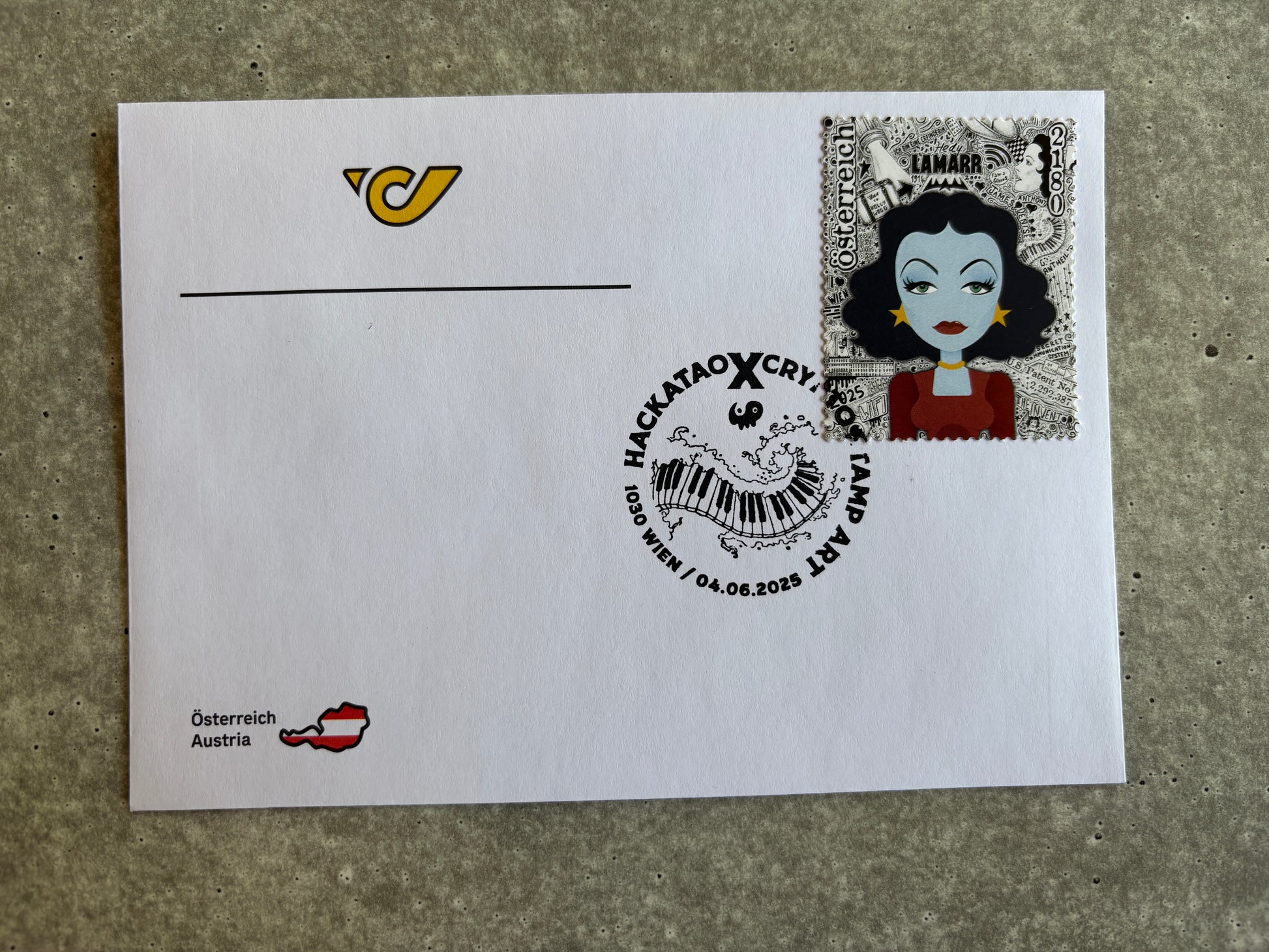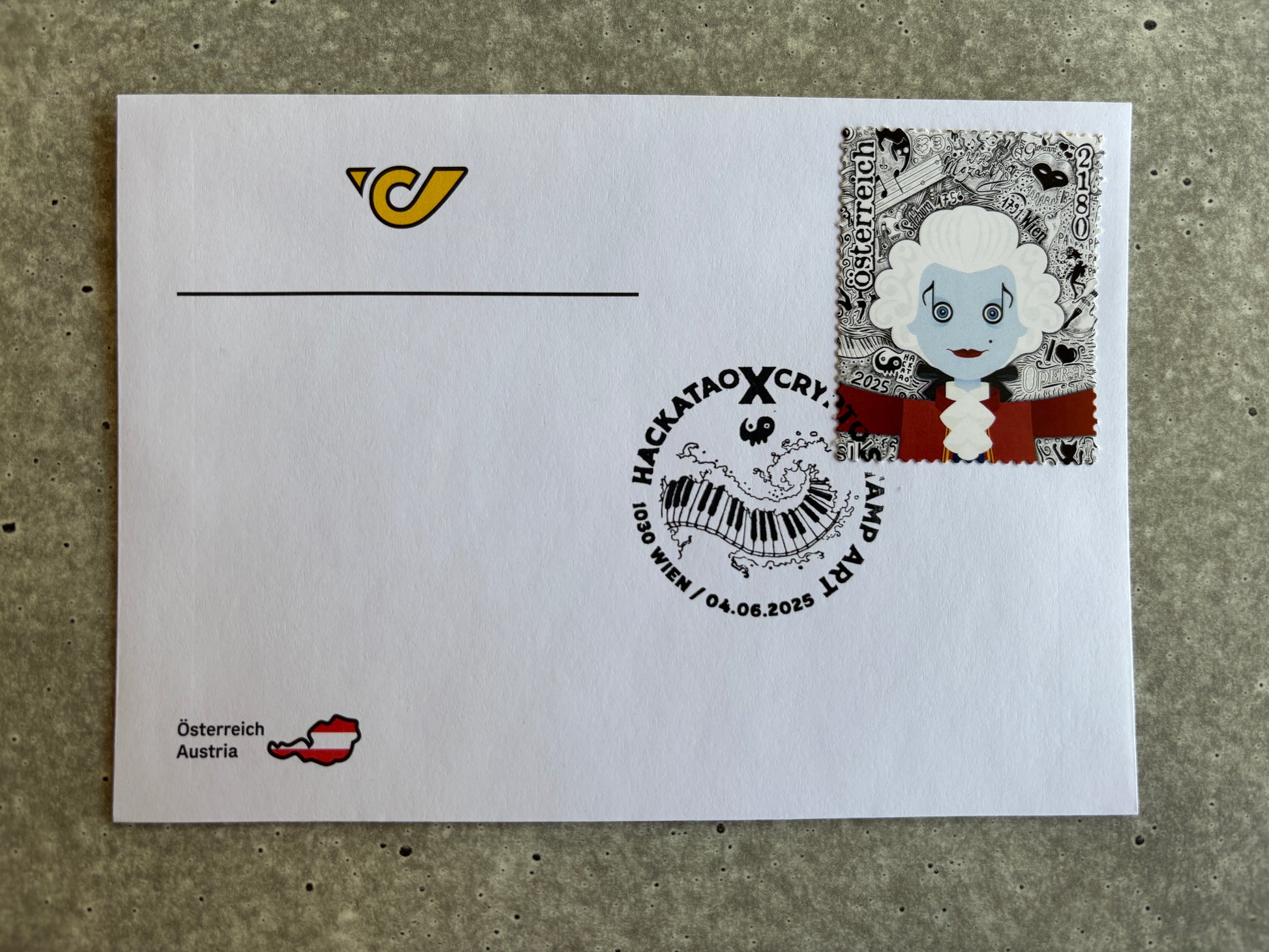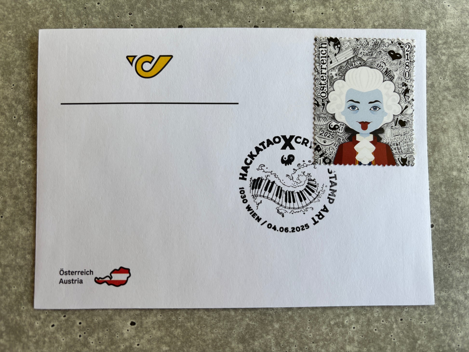 Hackatao Stamp 2: Llamar & Mozart - FDC Set of all motives (green).